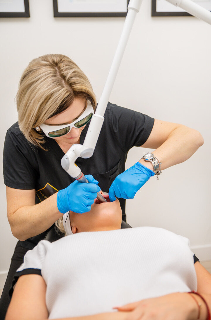 Most clients find it comfortable. The intraoral laser feels warm but not painful. No numbing is typically needed, and there’s no recovery time.