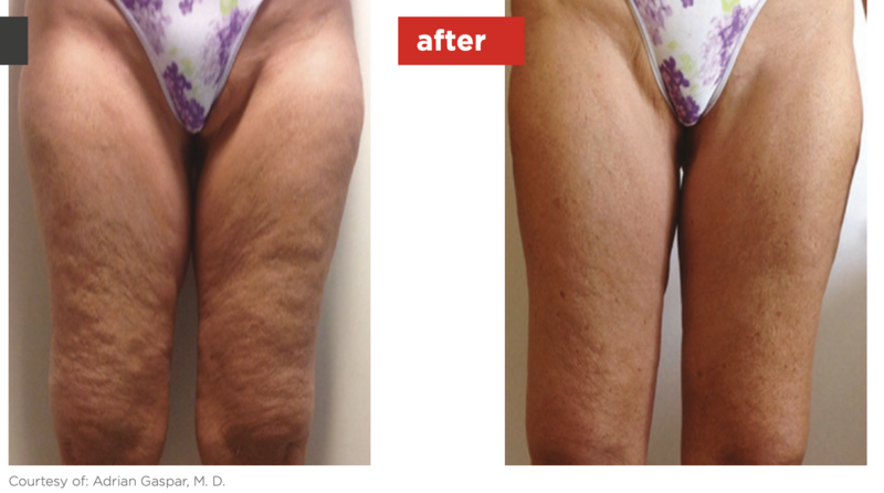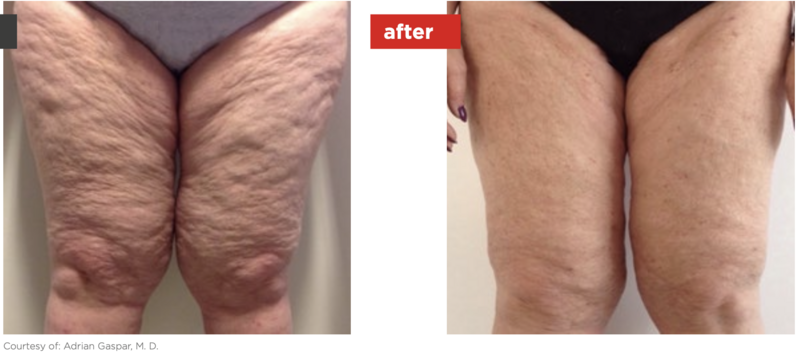 Penetrates into the hypodermis to stimulate metabolism, increase blood flow, and break up fibrous bands that cause dimpling.